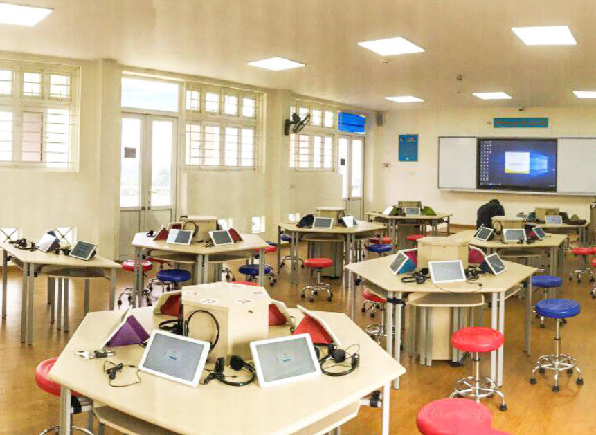 Phòng học thông minh SmartLab 4.0 được tích hợp màn hình tương tác 4K, hệ thống quản lý lớp học thông minh, bảng điện tử và thiết bị học tập cá nhân giúp tối ưu hóa việc giảng dạy và học tập.